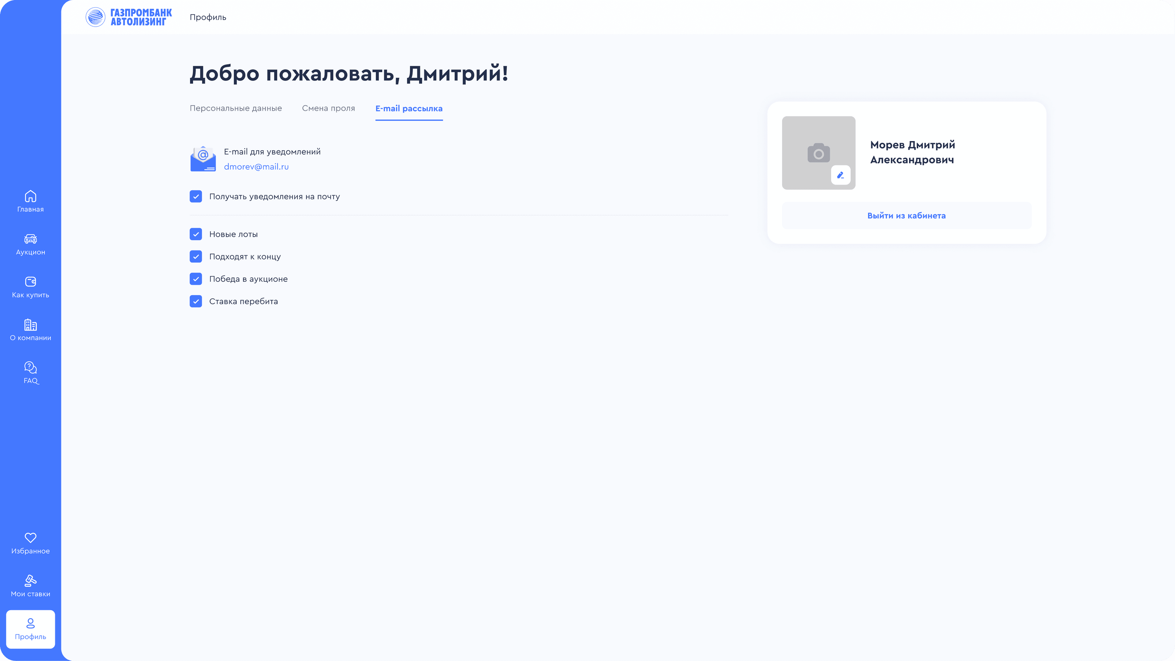 В разделе “Email-рассылка” вкладки “Профиль”, можно настроить получение почтовых рассылок. Для этого необходимо подтвердить электронную почту.